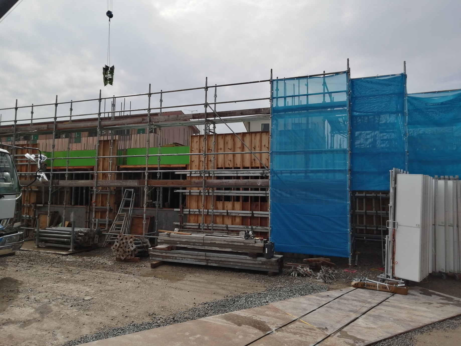 マンション。舟と呼ばれるスラブ開口用部材を運んでいます。